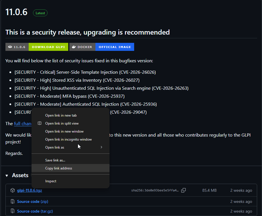 sudo wget https://github.com/glpi-project/glpi/releases/download/11.0/glpi-11.0.tgz