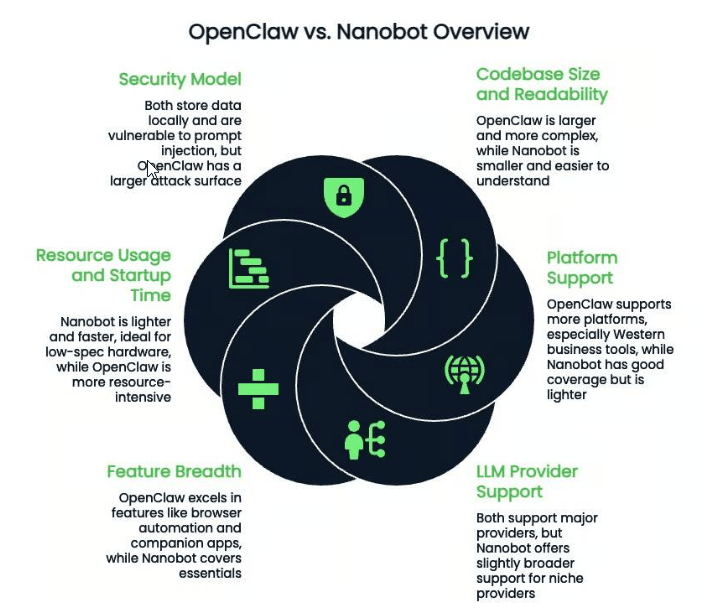 Nanobot’s smaller size and simpler architecture mean less to audit, though simplicity doesn’t guarantee safety. Both require careful permission management to mitigate risks.